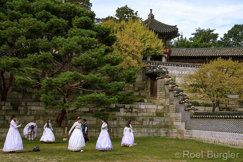 Kinderen in traditionele kleding spelen in Changdeokgung paleistuinen.